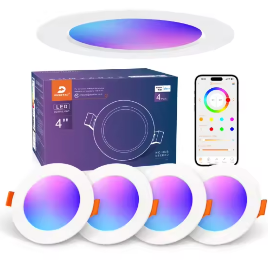 Set de 4 spoturi LED încastrate cu diametrul de 4 inch (~10 cm), ideale pentru iluminat smart și decorativ. Fiecare spot oferă lumină RGB multicoloră și alb reglabil (CCT) – de la cald la rece – perfectă pentru crearea atmosferei dorite.